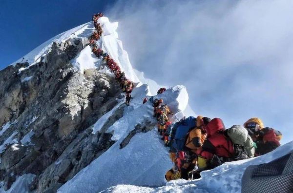 2019年5月,尼泊尔登山者尼玛尔·普尔亚·马加尔(Nirmal Purja Magar)在自己的Instagram账号上分享的一张照片引发了热议。照片中,珠峰上的登顶者沿着峰顶的一脊排成一列,等待登顶。七峰游(Seven Summit Treks)旅游公司的主席明玛夏尔巴(Mingma Sherpa)表示,登顶珠峰的费用将近10万人民币,排队时间在20分钟到1个半小时不等。