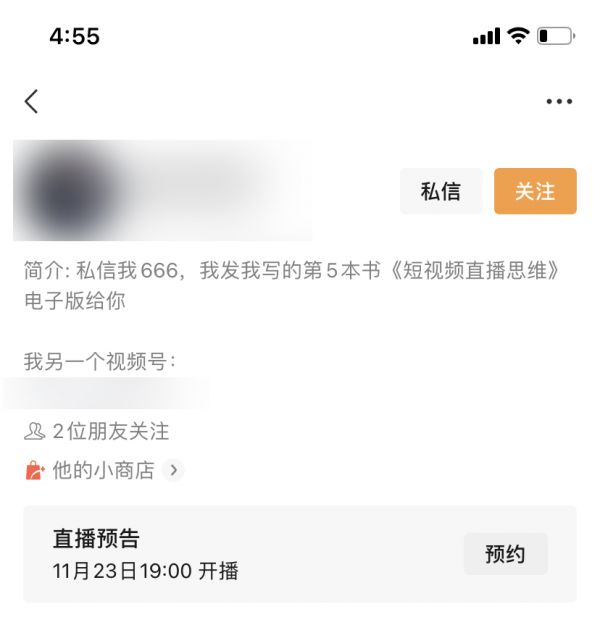 除了在个人简介区,在刷视频号的时候,我看到有一些号主会直接在名字放上微信号,这操作可以说是很骚了。