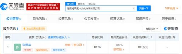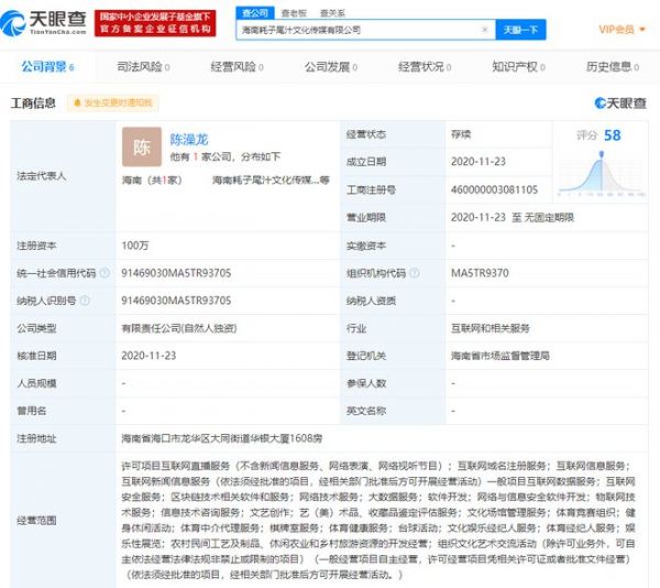 天眼查App显示,11月23日,海南耗子尾汁文化传媒有限公司成立,注册资本100万,法定代表人、全资股东为陈澡龙,经营范围包括许可项目互联网直播服务;互联网域名注册服务;互联网信息服务;互联网新闻信息服务等。