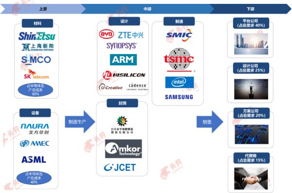 根据半导体行业协会统计,目前在国内半导体制造环节国产材料的使用率不足15%,先进工艺制程和先进封装领域,国产化率更低。在设备方面,国内自足率低、需求缺口极大,当前在中端设备实现突破,初步产业链成套布局,但高端产品仍是攻克难题。中国半导体行业产业链如下图: