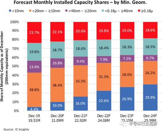 在这样的发展趋势下,按照IC Insights的统计和预测,各种半导体制程的市占率正向着相对更加均衡的方向发展,如下图所示。