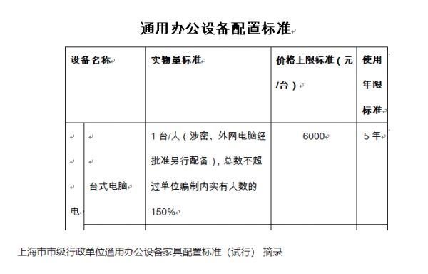 以上海市2014年8月15号出台的《上海市市级行政单位通用办公设备家具配置标准(试行)》为例,政府采购的台式电脑使用年限至少为5年,且价格不超过6000元人民币[4]。