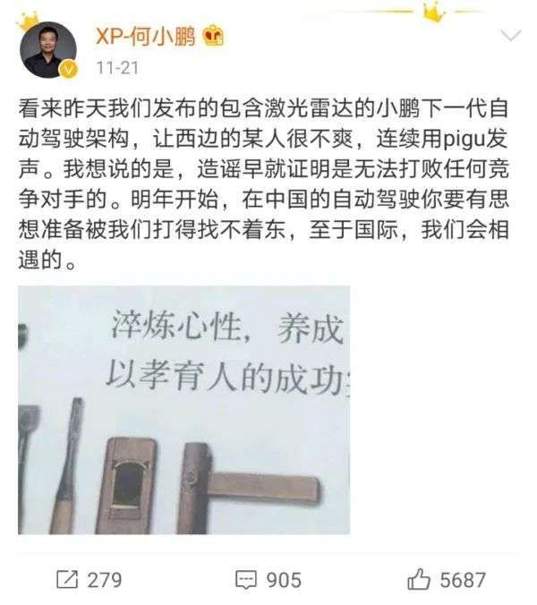 继李斌之后,特斯拉CEO马斯克再次与中国新造车企业高层隔空互怼。11月20日广州车展首日,小鹏汽车宣布2021年将推出首款搭载激光雷达的量产汽车,这一宣告在引起国外媒体关注的同时,也随即引来了马斯克的吐槽。马斯克在推特上暗含讽刺的说,小鹏汽车虽然有特斯拉的旧版软件,但没有特斯拉最新的神经网络计算机。对此,小鹏汽车董事长何小鹏在社交媒体上高调回应称,“明年开始,在中国的自动驾驶你要有思想准备被我们打得找不着东,至于国际,我们会相遇的。”