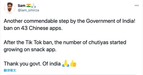在社交媒体上,赞成印度政府禁令的印度人不在少数,还有人甚至希望印度政府可以有更进一步的措施。一名名叫Sam的推特用户表示,印度政府的这些措施值得称赞。他在最后写道,“谢谢你,印度政府”。