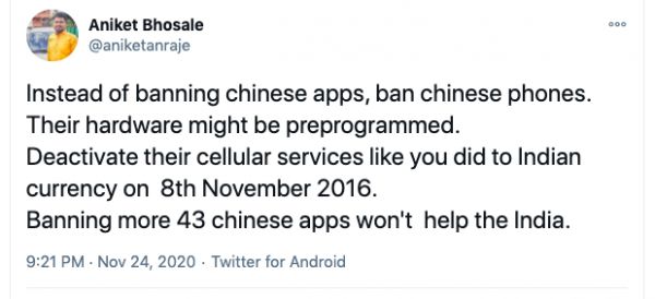 Aniket Bhosale在推特上建议,与其封掉中国应用,不如禁止中国手机,他们的硬件可能是预先编程了的。就像2016年11月8日,宣布废钞令那样,停用他们的手机服务。否则的话,再禁止43个中国应用程序也不会帮助印度。
