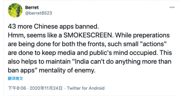 不过,也有的印度人认为,印度政府此举仅仅只是烟雾弹而已。Berret认为,“双方在前线都做了准备,这些小措施仅仅只是为了转移媒体和公众的注意力而已,同时也可以维持敌人心里‘印度人除了封禁应用什么也做不了’的心理。”