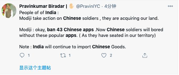 也有印度人觉得政府封禁应用的措施仍然不够。Pravinkumar Biradar开始在推特上提醒自己的同胞,印度政府禁用中国应用只是会让中国士兵们无聊而已,印度仍会进口中国的货物。