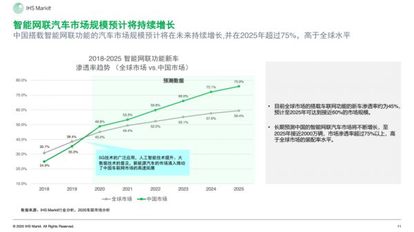 市场调研机构IHS Markit发布的《2020年中国智能网联市场发展趋势报告》显示,目前全球市场的搭载车联网功能的新车渗透率约为45%,预计至2025年可达到接近60%的市场规模。长期预测中国的智能网联汽车市场将不断增长,至2025年接近2000万辆,市场渗透率超过75%以上,高于全球市场的装配率水平。