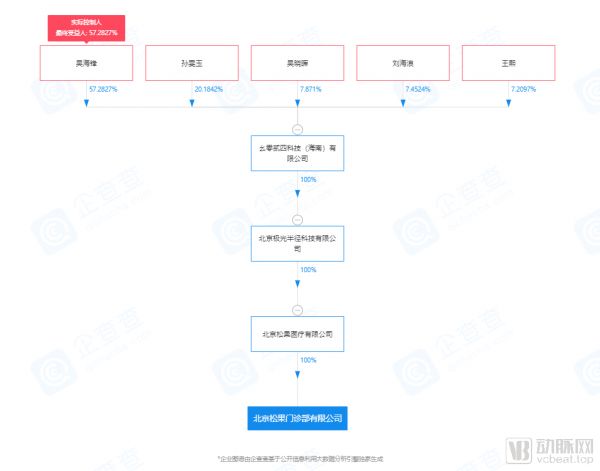企查查显示,字节跳动成立的“松果门诊”主体为北京松果门诊部有限公司,成立于今年6月,法定代表人为郑庆银。通过股权穿透发现,该企业隶属于幺零贰四科技(海南)有限公司,实际控制人和最终受益人为吴海锋。
