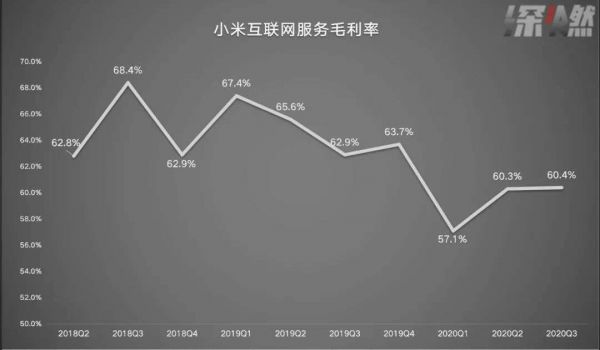 财报显示,小米的整体毛利率由2019年第三季度的15.3%降至2020年第三季度的14.1%,IoT和互联网的毛利率一增一降,分别由12.8%涨到14.2%,由62.9%降至60.4%。对于后者,小米解释,是金融科技及游戏业务毛利率下降所致。