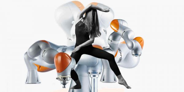 但是随后奇怪的事情出现了:聚光灯开始自行移动。它先是应和着舞者,然后它找到了自己的节奏,开始左右摇摆。很快,你都不清楚究竟是谁在领舞了。唯一清楚的是这是一场舞蹈,而其中一位舞伴身高9英尺,重500磅。它叫做ABB IRB 6700,是全球最大的工业机器人之一。