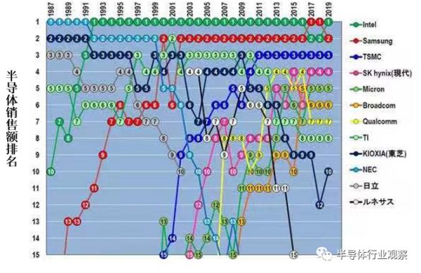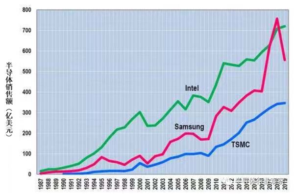 在半导体行业,英特尔、三星和台积电(TSMC)是当之无愧的龙头。从下图可以看到,2011年以后,英特尔、三星、台积电三家公司占领了全球半导体销售额的前三名。