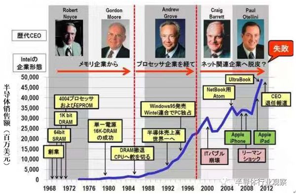 图2:英特尔的历代CEO、半导体销售额。(图片出自:笔者依据电子工业年鉴和电子期刊《半导体Data Book》制作了此图,CEO的照片出自英特尔博物馆《英特尔的历史》)