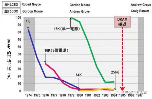 1975年摩尔从副社长就任CEO,格鲁夫升为COO(首席运营官)。在摩尔担任CEO的初期,英特尔从4K代到16K代,一直是DRAM的巨头企业。但是,大批的日本半导体企业进入,英特尔的占比大幅度下滑。在256K世代,英特尔的占比仅有1.3%。(如下图3)