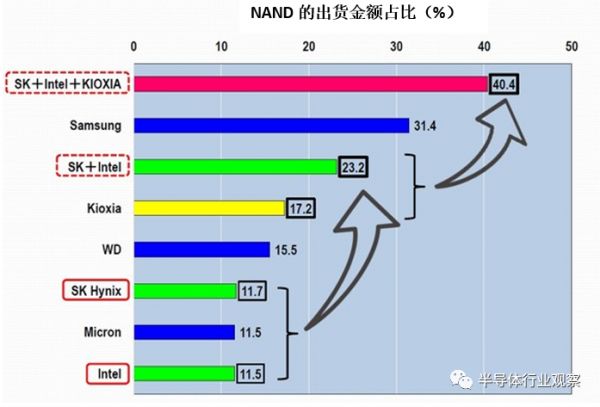 再者,SK海力士已经成功收购英特尔的NAND业务,SK海力士持有铠侠15%的股份,未来很有可能形成SK海力士+英特尔+铠侠的大型联合组(如下图8)。届时联合组的市占比会是40.4%,超过三星的31.4%。