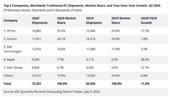 首先是消费市场的买单,今年“黑天鹅”加速了全球PC市场的进一步复苏。2020年第二季度,全球PC市场出货量达到7226.1万台,同比增长11.2%,创下近年来最大涨幅。这是因为疫情期间线上教育和在家办公人群对于PC设备需求增长所起到的强劲带动作用。