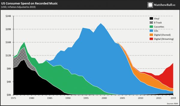 考虑下图,音乐技术在七十年间跨越了六种不同的媒介(黑胶唱片、八轨道磁带、卡带、光盘、离线下载、流媒体),尽管创造了新的流派,出现了新的声音和乐器,货币化也发生了两次变革,但我们却只看到行业收入在最好的时候被取代,在最坏的时候一直减少。还要注意的是,核心的听觉体验也在不断改进:磁带给录制的音乐带来了便携性,CD带来了高质量和定义的曲目开始/停止,下载意味着你的整个音乐库与你一起旅行,而流媒体意味着整个音乐库可以随时使用。事实上,这些进步是如此之大,以至于听众花费了数十亿重新购买他们已经拥有的新格式的音乐。但重新购买旧音乐并不是一个增长的市场。