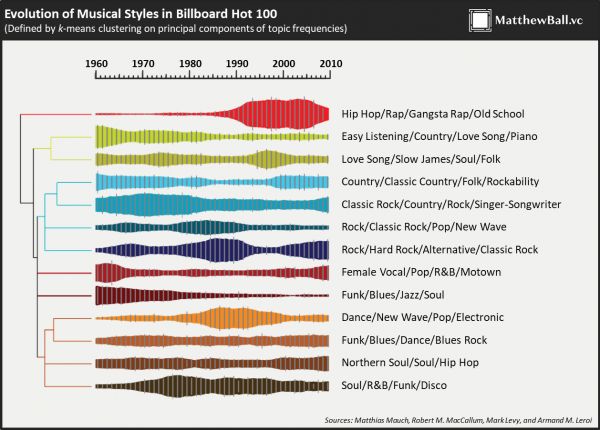 音乐提供了一个很好的视角来观察技术、商业模式和内容之间的相互影响。分别涵盖了近70年、近20年和近1年的情况。