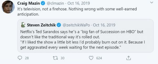 并非所有的变化都是好的。有些人认为,向系列化内容的转变也导致了过长、臃肿的系列剧。事实上,每部喜剧只有22分钟,这意味着有些好的笑话被留在了剪辑室的地板上,但坏的笑话和叙事脂肪也被留在了地板上。就像当每一集都充满了广告,并且间隔167个小时播出时,很难让观众继续观看一样,当观众只需要坐在沙发上等待无广告的自动播放时,让观众继续观看可以说变得太容易了。Netflix联合CEO Ted Sarandos实际上已经承认,流媒体让不那么引人注目的节目得以生存,他说自己是HBO的《继承之战》的忠实粉丝,但 “如果我对这个剧的喜欢程度再低一点,我可能就放弃了,因为我每周都要等待下一集,实在是太憋屈了。” (Craig Mazin 是HBO《切尔诺贝利》的编导&编剧,以及即将推出的HBO系列剧《最后生还者》)。