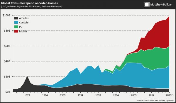 电子游戏与音频是另一个不可思议的对比。在这里,我们看到的是持续的加法式增长。新技术的运作就像地质地层一样,彼此相辅相成,从不需要蚕食或替代。