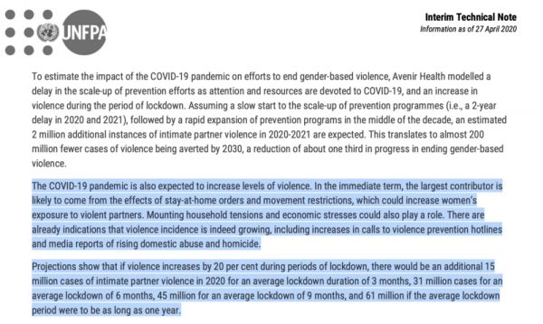报告原文写道:“预计新冠疫情会加剧暴力等级。从短期来看,最大的原因可能是居家命令和行动限制,这可能增加妇女接触暴力伴侣的机会,日益紧张的家庭关系和经济压力也可能有所影响。已经有迹象表明,暴力事件的发生率确实在上升,包括打给预防暴力热线(violence prevention hotline)的电话有所增加,媒体对家庭虐待和杀人案件的报道也有所增加。预测显示,如果暴力事件增加20%,平均戒严时间持续3个月的话,2020年的亲密关系暴力案件会增加1500万起……”
