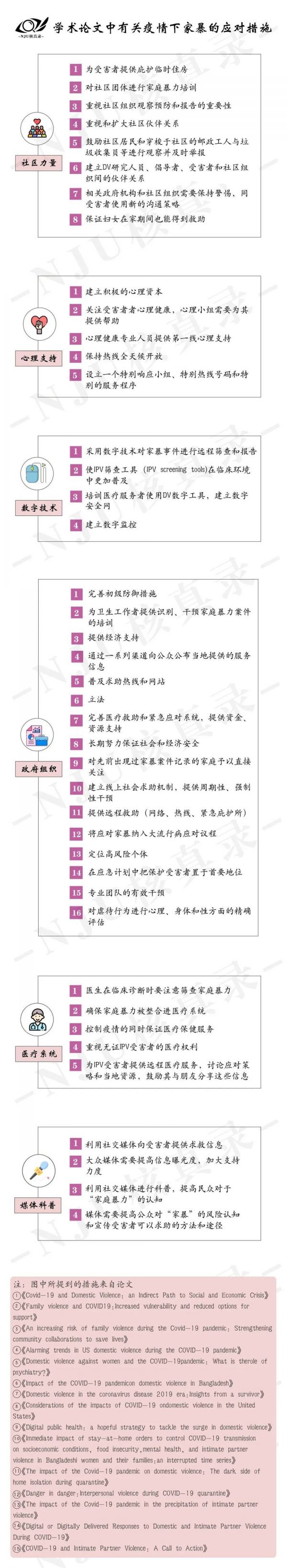 疫情期间增加的家暴数量也引起了学术界的关注,核真录记者在谷歌学术中以“domestic violence+pandemic”“domestic violence+covid”为关键词进行检索,在搜索结果中抽取了15篇有关疫情期间家暴行为与措施的学术论文,并对其提出的针对性建议进行初步梳理和统计。