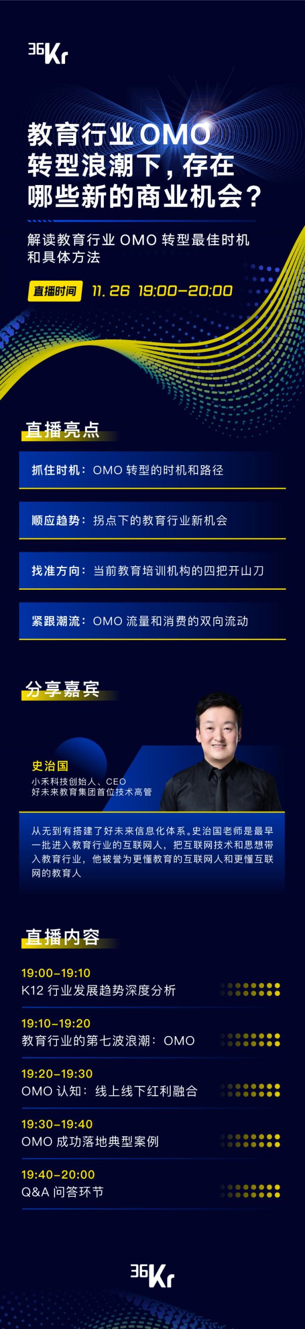 为了解决教育企业面临的以上问题,36氪特别举办教育系列直播讲座。「36氪教育系列直播讲座」是由36氪推出的教育行业垂直性栏目,服务于广大的教育赛道创业人群。36氪将以专业的教育行业研究角度,为用户提供更为全面、实用和有启发性的行业前沿观点和案例,赋能教育企业成功转型。