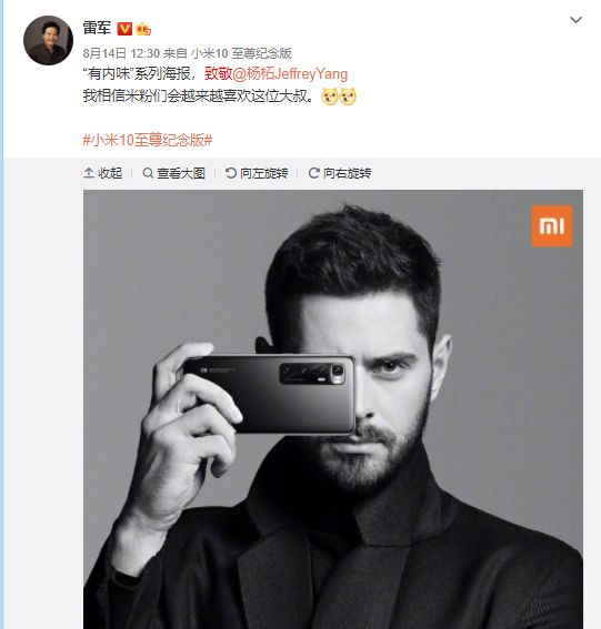 在营销“大师”杨柘的的操盘下,小米10至尊纪念版的系列海报画风较小米此前产品调性变化明显。雷军在微博连续晒出多张海报并向网友发问“有内味吗?”内味,显然是指高端的味道。