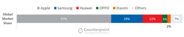 名次虽然好看,可具体对比规模,小米市占率仅为2%,与苹果的57%、三星的19%、华为的12%之间相差远不止一个身位。甚至,没有把高端化作为核心发力目标的OPPO,其市场份额也要比小米高出一个百分点。