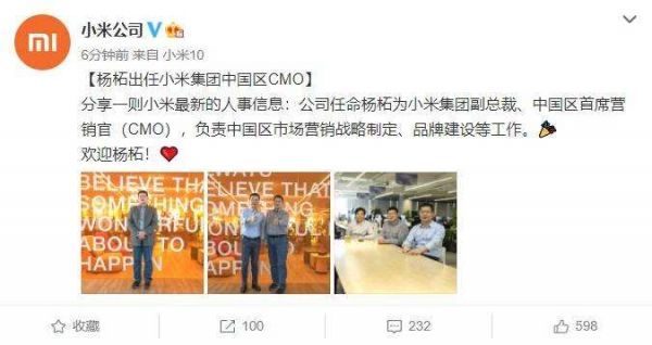 11月20日小米发布内部信,杨柘因身体原因不再担任小米中国区首席营销官职务,转任中国区营销顾问。