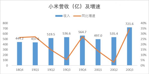 本季度,小米721.6亿元的营收规模创下公司历史最高记录,34.5%的同比增速不仅远高于1、2季度的13.6%和3.1%,更是过去8个季度的新高。
