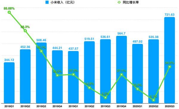 三季报发布前,市场普遍预期小米当季收入700亿元左右,小米的答卷是721.63亿元,创历史新高,同比增长34.5%,一举扭转上半年低迷的态势。