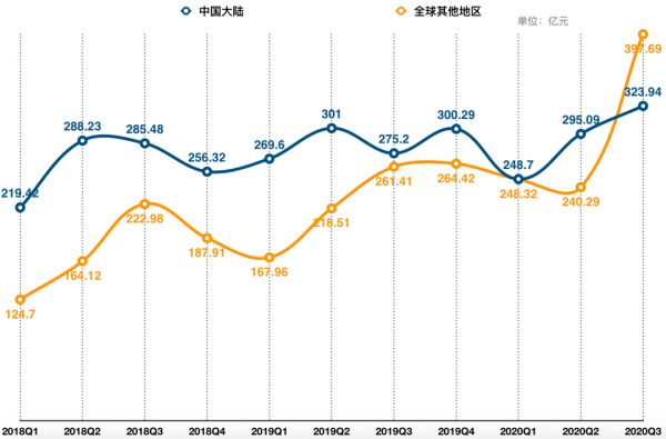 小米还有一项创新高的数据来自境外市场收入。小米当季境外市场收入397.69亿元,同比增长52.1%;中国大陆地区收入323.94亿元,同比增长17.7%。
