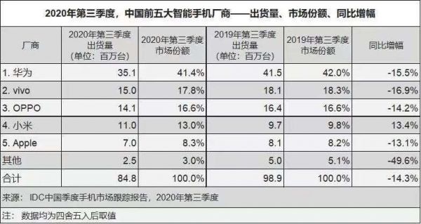 IDC公布的数据显示,2020第三季度,华为以41.4%的市场份额位居第一,小米仅占13%。但值得注意的是,中国前五大手机厂商中,只有小米的出货量实现了同比增长。