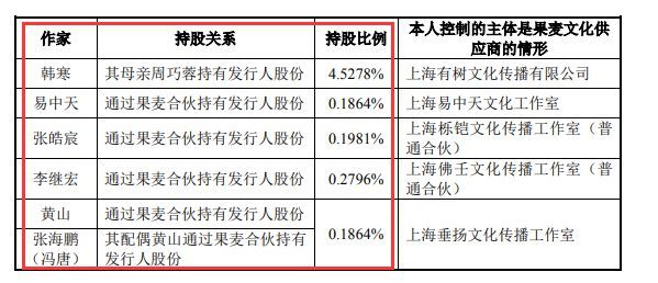 不仅韩寒,易中天、张皓宸、冯唐妻子黄山等多位知名作家或其亲属,都通过果麦合伙,间接持有果麦文化的股份。
