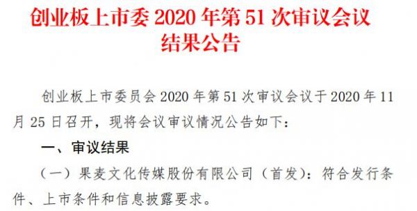 11月25日举行的创业板上市委员会第51次审议会上,果麦文化、中兰环保、创益通IPO通过审核。其中果麦文化作为一家以图书策划与发行为主营业务的公司,因旗下坐拥韩寒、冯唐、严歌苓、易中天、杨澜等众多文化名人IP而备受资本市场关注。