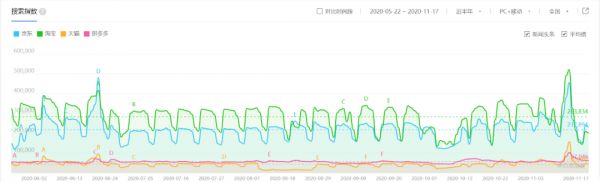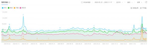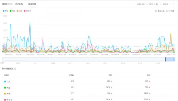 “搜索指数”代表了互联网用户对关键词的关注程度,“媒体指数”则体现了媒体对相关关键词报道的数量。从近半年的媒体指数看,京东的日均值甚至高于“淘宝”+“天猫”+“拼多多”之和。
