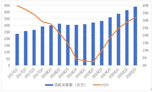 京东过去一年新增活跃买家约1亿人次,且经历了前两年的增速放缓后,最新一期在获客成本几乎不变的前提下,同比增速重返30%以上。