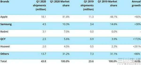 对于苹果此举,事实上也有观点给出了“诛心之轮”,并称其放任山寨AirPods的逻辑,与当年微软放任盗版Windows/Office的泛滥有着同样的想法,由于AirPods系列较高的市场定位,所以山寨产品所面向的是价格敏感型用户,因此挤压的也是同价位其他TWS耳机产品的生存空间。事实上在Canalys发布的2020年第一季度全球智能音频设备出货量数据报告中显示,AirPods的市场占有率已经从去年第一季度的48.1%降低到今年同期的41.4%,而三星、小米,以及华为此类产品的增长则极为明显。