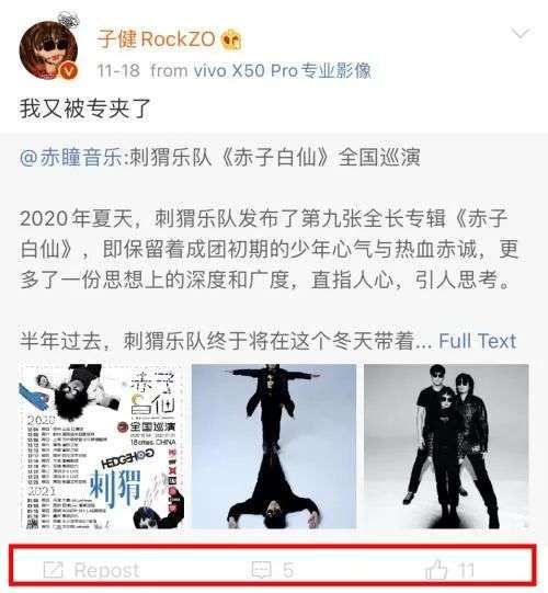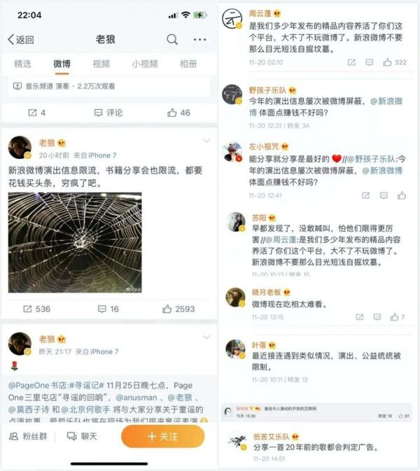这次站出来的是音乐人,一向以温和形象示人的老狼难得在公众场域发作,发微博称:“新浪微博演出信息限流,书籍分享会也限流,都要花钱买头条,穷疯了吧。”很快,周云蓬、野孩子乐队、左小祖咒等一大批独立音乐人们云集在这条微博之下表达不满。