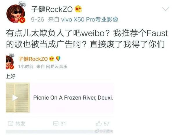 一方面,对于独立音乐人们,除了微信公众号和短视频账号等私域流量,在微博发布演出信息是能获得一定声量的少数公开渠道,微博“被夹”直接影响他们的生计;另一方面则看起来更不可理喻,他们分享音乐和书籍的信息也会被判“广告”,刺猬乐队主唱子健提到自己分享歌手Faust的音乐也“被夹”,那是1993年的老歌了。