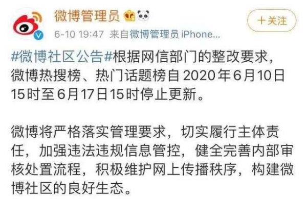 2018年的“紫光阁地沟油”事件就曾导致微博热搜榜下线一周。同样的故事发生在今年6月,因错误引导舆论,微博热搜停更的消息带动全网热议。新浪微博再次表示将加强违规信息管控,完善内部审核处置流程。