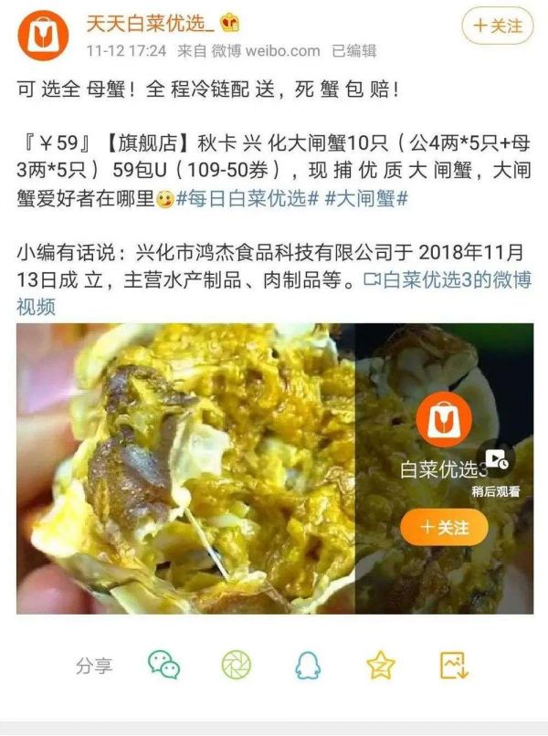 事情还要从11月12日开始说起。是日,微博上一个叫“天天白菜优选”的卖货领券平台号,以不合市场规律的低价隆重推出“兴华大闸蟹”,10只59元包邮,其文案说明:“兴化大闸蟹10只(公4两*5只+母3两*5只)。