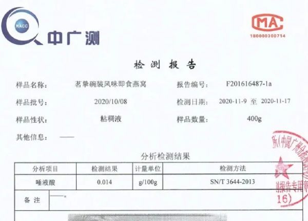 报告显示,该产品定位为风味饮料,不是燕窝。成分上,产品蔗糖含量达4.8%,成分表里碳水化合物为5%,蛋白质含量为0,并且100克里含有的“功效”物质燕窝酸价值仅有人民币0.07元。