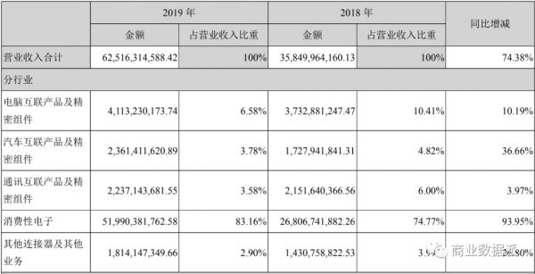 其中,2015至2019,消费电子业务收入规模从44.16亿元提升至519.9亿元,四年增长近12倍,收入占比达到83.16%。同期,通讯互联业务收入规模从7.03亿元提升至22.37亿元,四年间增长超3倍;汽车互联产品从8.42亿元提升至23.61亿元,也增长近3倍。