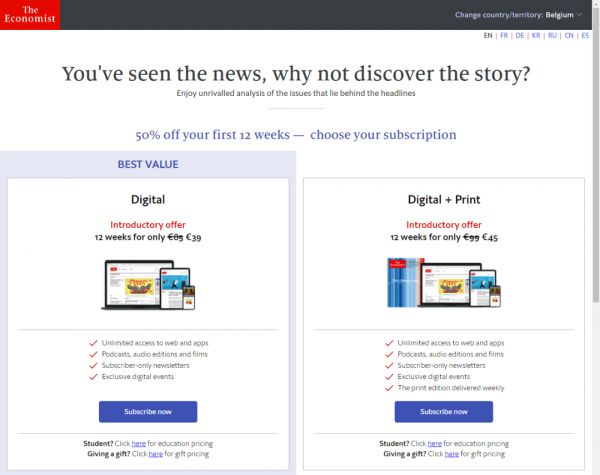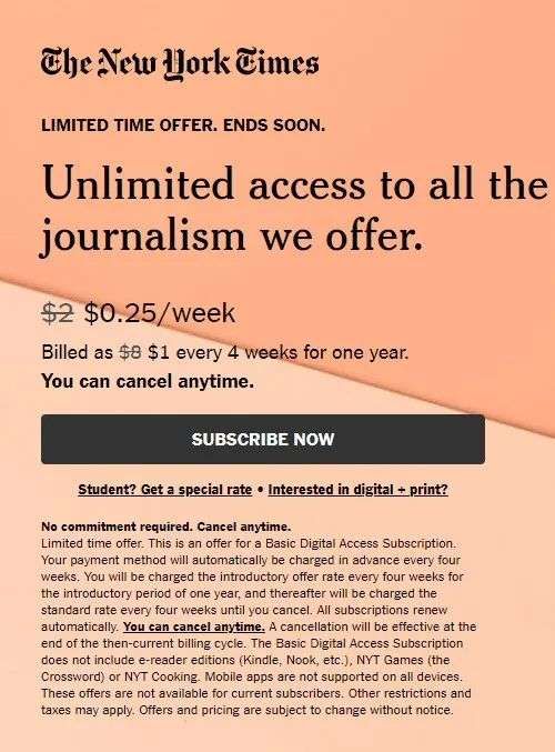 简单地说,“硬收费墙”屏蔽该平台的所有在线内容,要求用户订阅才能完整地观看。《经济学人》在过去十年里采用了这种模式,而《华尔街日报》和《金融时报》等新闻机构自上世纪90年代以来就成功地运用了“硬付费墙”。