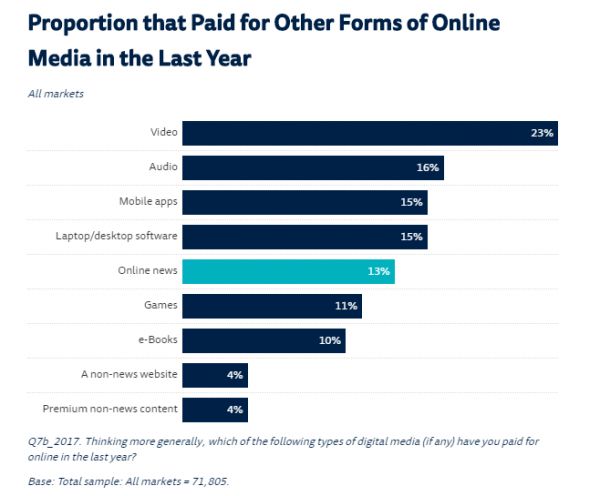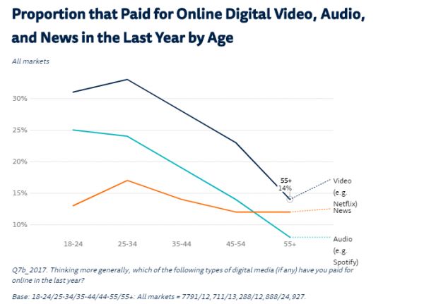 路透社2017年的一项数字新闻研究显示,所调查的36个国家和地区中,相对于付费新闻,付费的在线音乐和视频服务如Spotify和Netflix拥有更强大的立足点。而为音视频付费的用户大多为年轻人。