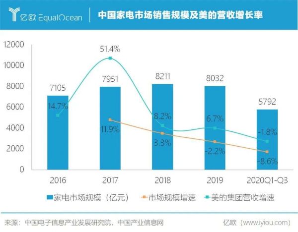 美的集团的营业收入也与家电市场的繁荣程度紧密关联。2017年其营收突破2000亿元,同比增长高达51.3%,但2018年起增速逐年下降,2020年前三季度同比下降1.81%。