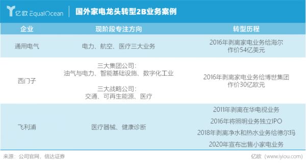 GE在2016年将旗下家电业务资产卖给海尔,西门子于2016年将家电业务出售给博世集团,飞利浦先后剥离彩电、照明和小家电业务,三大巨头纷纷将交通、能源和医疗领域作为发展重点。