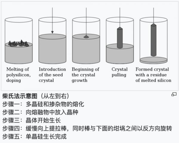 注意,这个时候得到的还只是多晶硅,它的晶体框架结构是无序的。多晶硅可以用于光伏产业(太阳能发电),但不能用于芯片制造。原因在于,芯片制造需要稳定的晶体框架结构,每个部分的电学特性都必须相同,然后才方便加工。所以,还需要有办法把多晶硅转换为单晶硅。目前,半导体行业常用的办法是柴可拉斯基法(Czochralski process)。